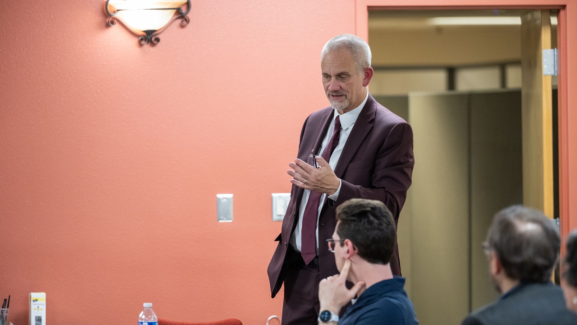 CUTLINE: New Mexico State University President Valerio Ferme spoke to faculty and students who are working on the Plutonium Workforce Development Initiative and Los Alamos National Laboratory officials during a campus visit. (NMSU photo by Josh Bachman)