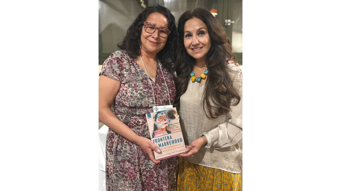 CUTLINE: Maria Cristina Morales, University of Texas at El Paso professor, and Cynthia Bejarano, New Mexico State University Regents professor, holding the anthology they edited, “Frontera Madre(hood: Brown Mothers Challenging Oppression and Transborder Violence at the U.S.-Mexico Border,” which earned a second award at the Southwest Book Awards ceremony on Feb. 28. The professors’ book received a gold award at the International Latino Book Awards last fall. The cover of the award-winning anthology features Paula Flores Bonilla, a leader in the quest for justice for her daughter and hundreds of other women murdered in Juárez since the 1990s. (Courtesy photo)