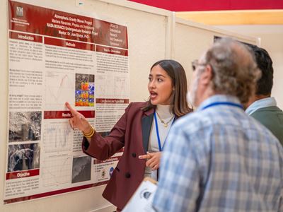 CUTLINE: NMAMP_01: Mariana Navarrete Ovalle, a physics major at New Mexico State University, presents her research project the 2025 NM AMP Research Conference, which took place in October at the NMSU main campus. (NMSU photo by Hanna Muñoz Villalobos)