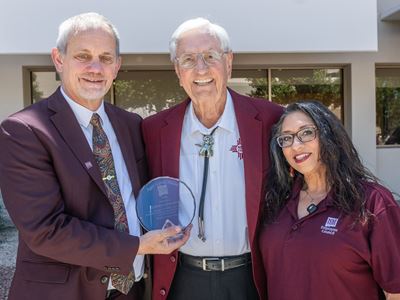 CUTLINE: Garrey E. Carruthers, center, was presented the New Mexico State University Aggie Legend award by New Mexico State University President Valerio Ferme, left, and Sonia White, Employee Council chair, at NMSU’s Founders Day event, April 15. (NMSU photo by Josh Bachman)