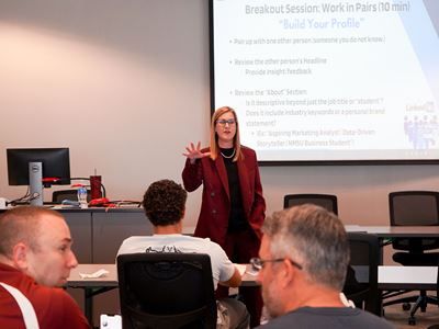 The second session, Polish Your Profile, was presented by Noah Torres, president of the NMSU American Marketing Association (AMA), alongside AMA faculty advisor Dr. Erin Blaugrund. The workshop offered students a strategic look at enhancing their LinkedIn presence, from crafting strong profile summaries to effectively showcasing experience and accomplishments.