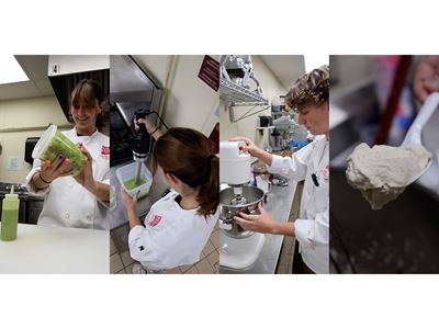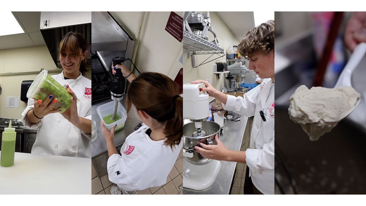 Cutline: HRTM student Kacey Thunborg, left, makes a lemon-basil vinaigrette. HRTM student Logan Norton prepares a batch of butter pecan whipped cream. (NMSU photos by Tatiana Favela)