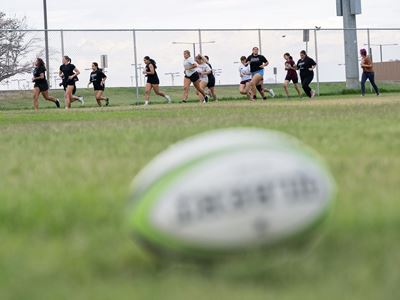 CUTLINE: New Mexico State University women’s rugby team player Samantha Rodriguez clutches a ball during a practice session. (NMSU photo by Josh Bachman)