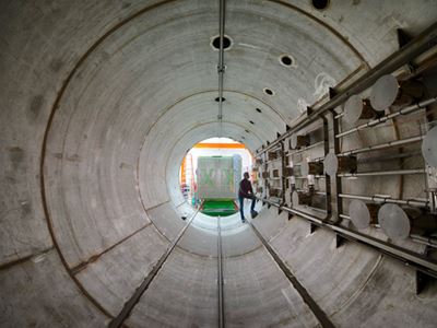 CUTLINE: Workers install a component of MicroBooNE’s precision detector (called a time projection chamber) into the cylindrical container, or cryostat. (Fermilab photo by Reidar Hahn)