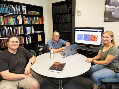 CUTLINE: Astronomers from Northwestern University and New Mexico State University discover a new planet in old data. Pictured from left to right, NMSU third-year graduate student William Roberson, NMSU Astronomy Assistant Professor Eric Nielsen and NMSU fifth-year doctoral candidate Anne Peck are co-authors on the paper. (NMSU photo by Sarah Kimmerly)