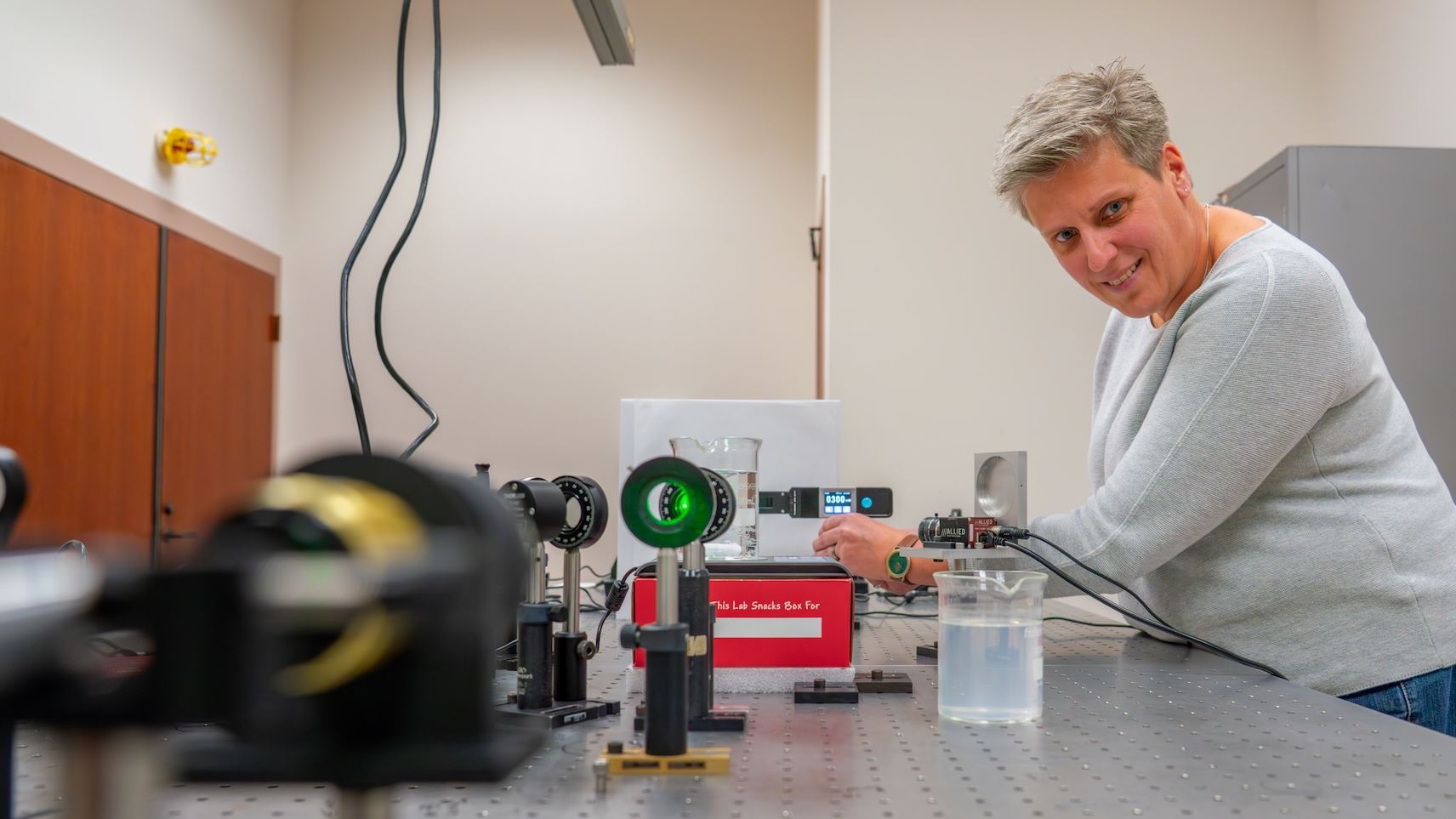 Photo description: An optical instrument is set up in a laboratory, where a green laser beam passes through a beaker of water.