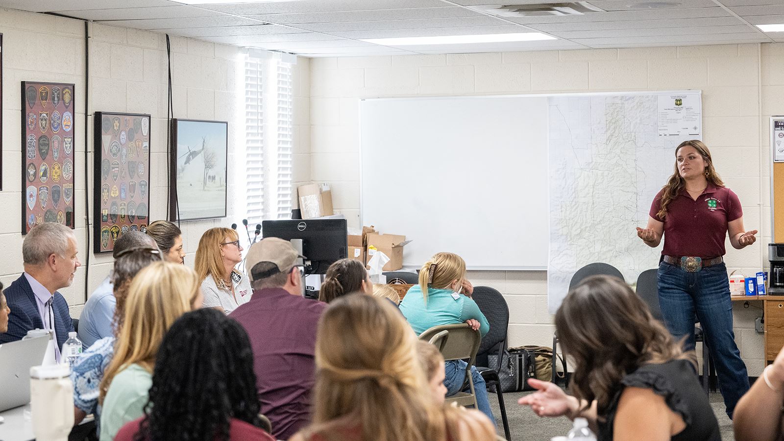 CUTLINE: Hidalgo County 4-H Council President Skyla Strain spoke during the New Mexico State University Cooperative Service Extension tour stop in May 2025. Youth often shared their experiences in programs such as 4-H and FFA. (NMSU photo by Josh Bachman)