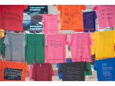 The Clothesline Project is an interactive exhibit displaying T-shirts with powerful messages and illustrations to raise awareness about the impact of violence and abuse. With anonymous stories written about numerous forms of interpersonal violence, the shirts in the display are color-coded with 11 distinct colors: yellow representing domestic violence and assault; red, pink, and orange represent survivors of rape and sexual assault; blue and green represent survivors of incest and sexual abuse; and white represents someone who died because of violence.
